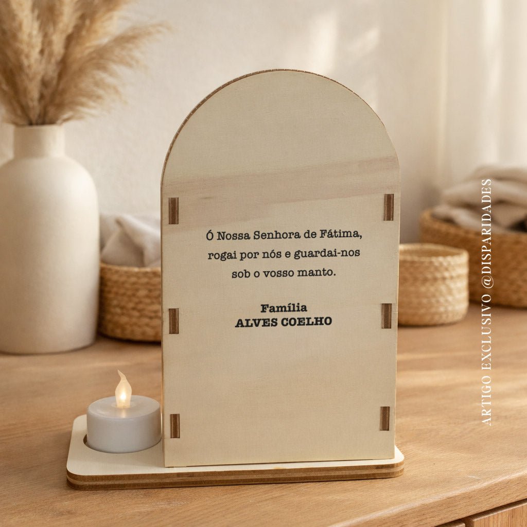Produzido em madeira, com detalhes em acrílico e imagem impressa através de tecnologia UV para cores vivas, nítidas e efeito 3D, este oratório alia resistência à delicadeza do design. A moldura elegante valoriza a profundidade da cena e cria um efeito visual envolvente, enquanto a base sólida garante estabilidade e presença em qualquer espaço. Inclui um espaço dedicado para colocar um terço, mantendo este símbolo de oração sempre junto à imagem. Acompanha ainda uma vela LED de oferta, que oferece uma luz suave e segura, perfeita para criar um ambiente acolhedor e contemplativo. Na parte traseira, pode ser personalizada com uma frase especial, tornando esta peça ainda mais íntima e única 🤍
