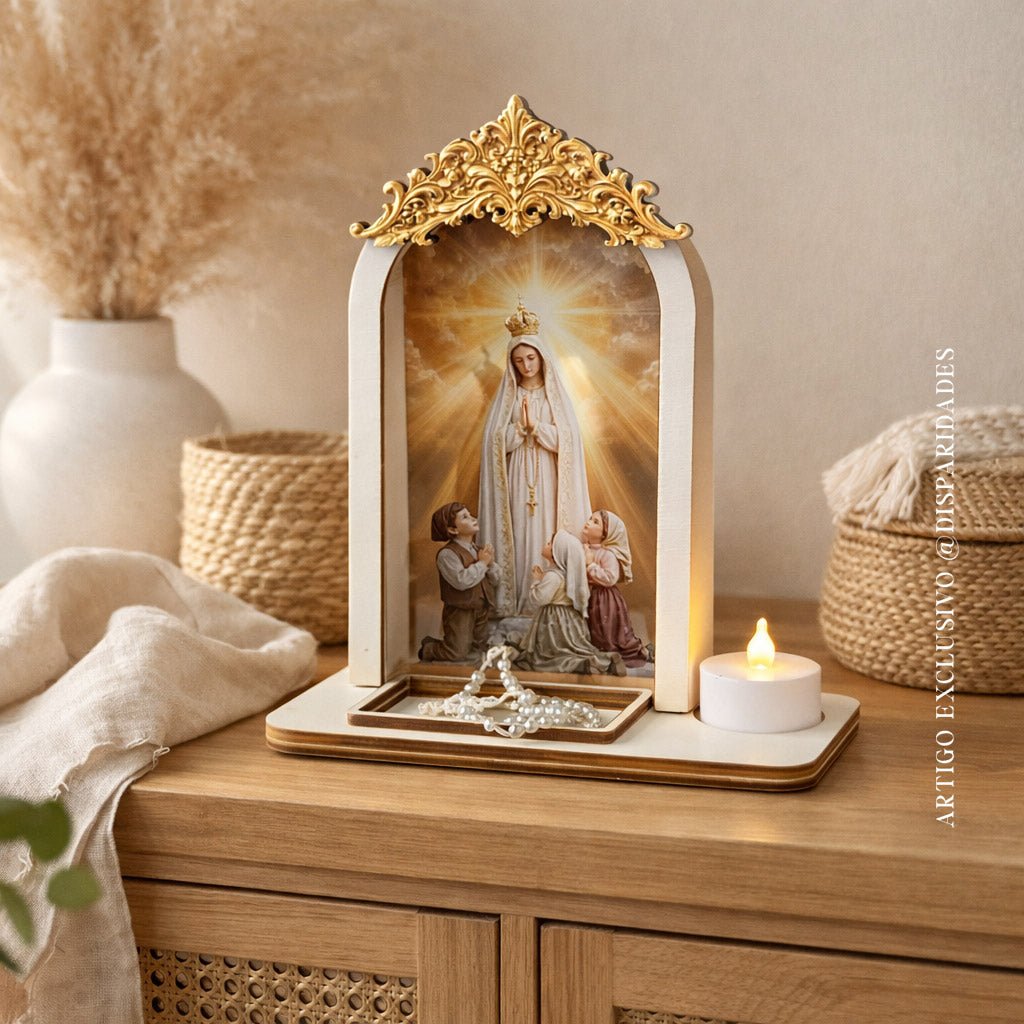 Há objetos que nos fazem abrandar o passo. Que pedem silêncio, luz suave e um instante só nosso. O Oratório de Nossa Senhora de Fátima | 13 de maio nasce desse desejo de recolhimento – um pequeno refúgio onde a fé encontra espaço para respirar. A imagem iluminada evoca a serenidade das aparições de 13 de maio, transmitindo proteção e esperança, como uma manhã clara na Cova da Iria ✨