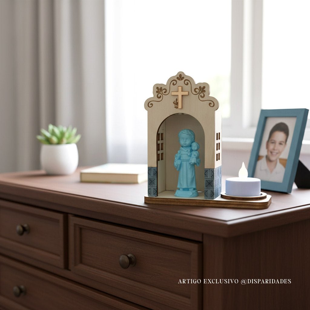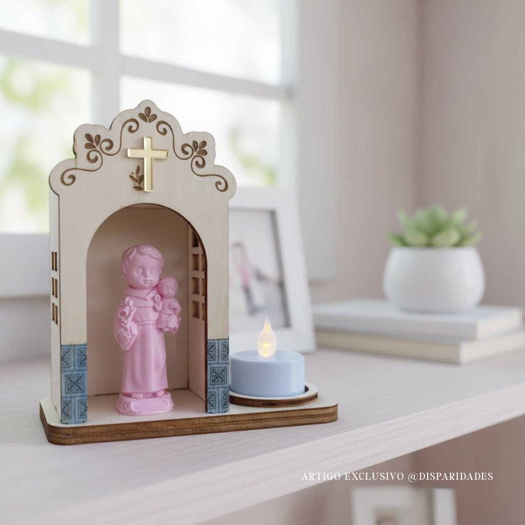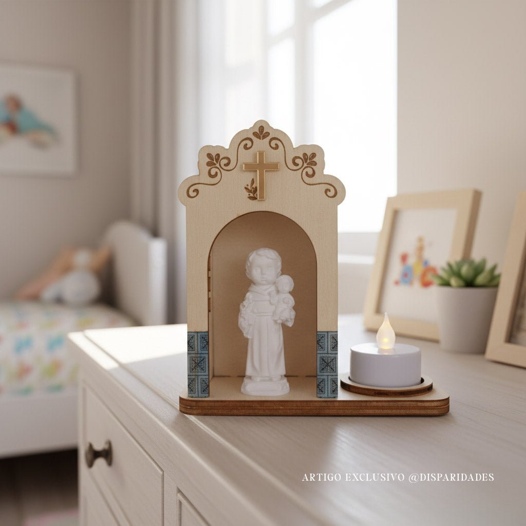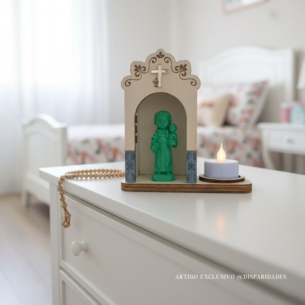 Um mimo cheio de fé e tradição 🇵🇹✨ Este Oratório de Santo António foi pensado para encantar os mais pequenos, com linhas delicadas em madeira natural e pormenores que lembram os típicos azulejos portugueses. No topo, brilha uma cruz em acrílico dourado que dá um toque especial de luz e esperança. A imagem do Santo é feita em PLA, um bioplástico de origem vegetal — amigo do ambiente e seguro para crianças. Podes ainda personalizar com uma frase na traseira do oratório e acender uma vela com carinho. 💛