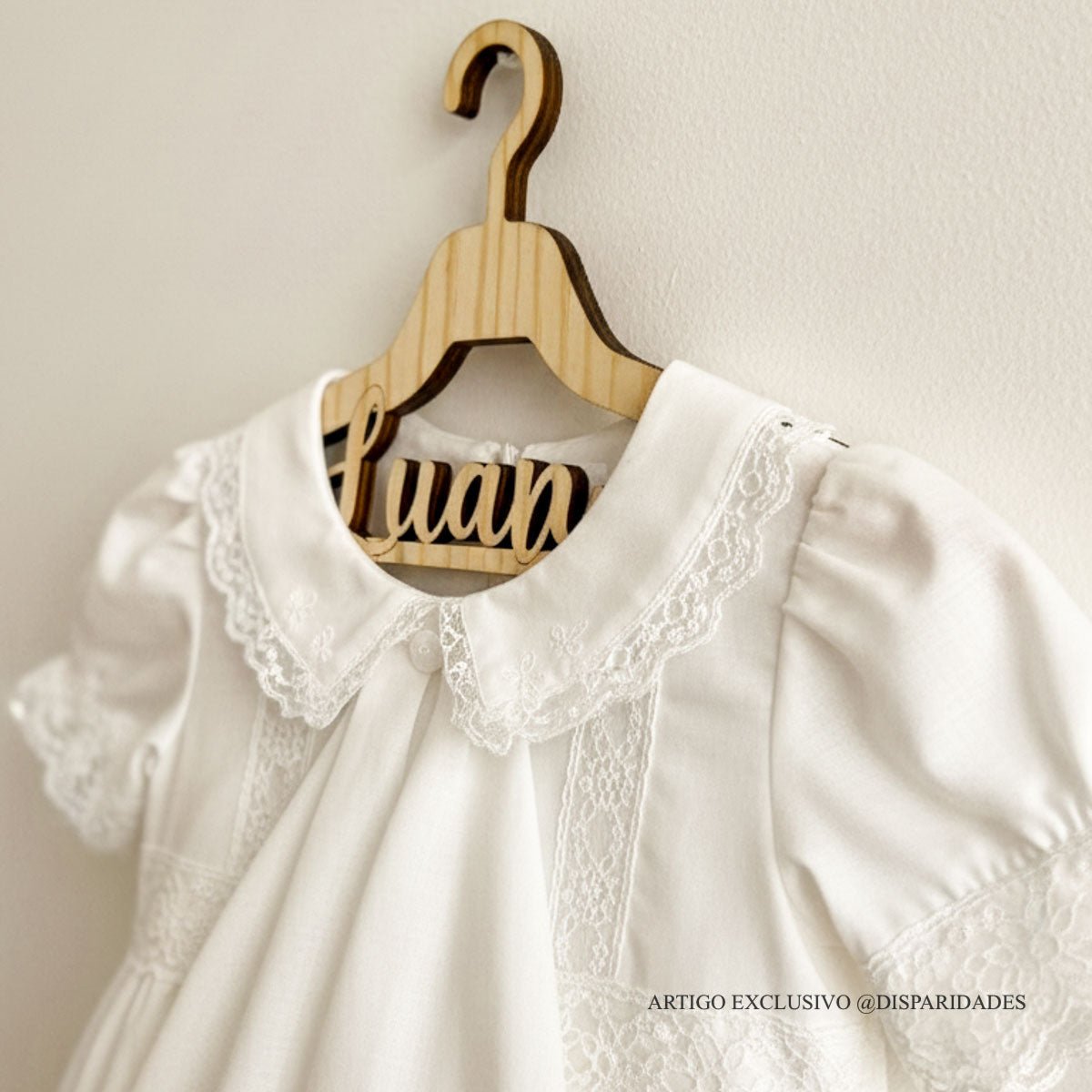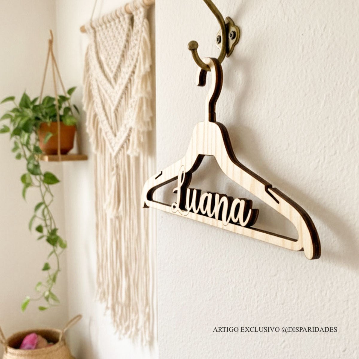 Feito com todo o cuidado, pode ser produzido em MDF branco (melamina), pinho ou carvalho, permitindo escolher o acabamento que melhor combina com o estilo do evento. Cada cabide é recortado com o nome da criança, tornando-se também uma lembrança inesquecível para guardar com carinho depois da celebração.