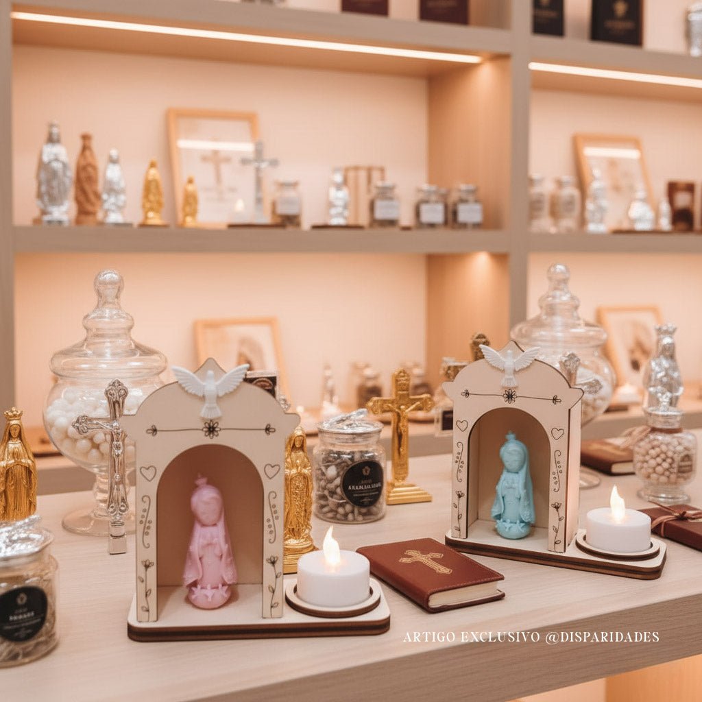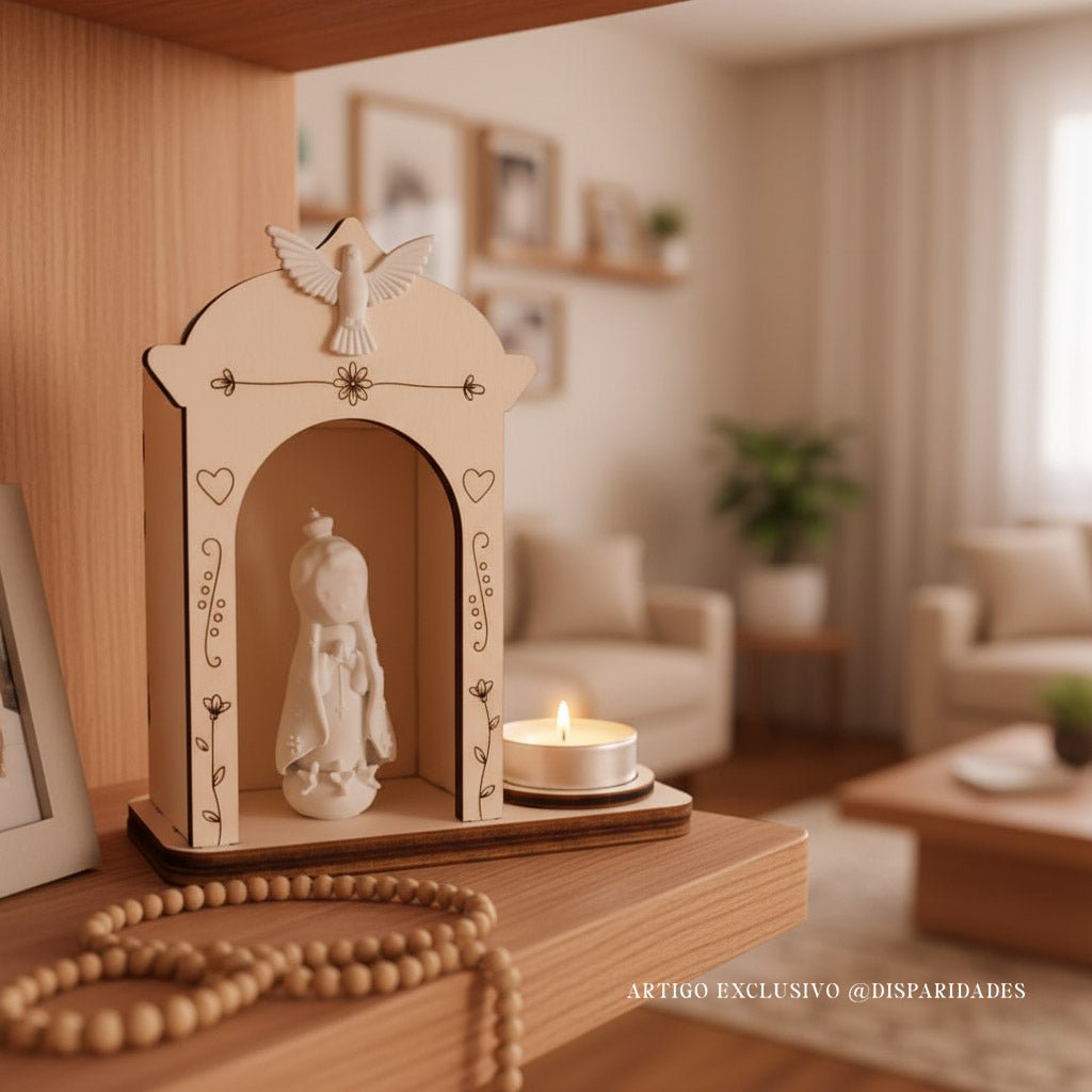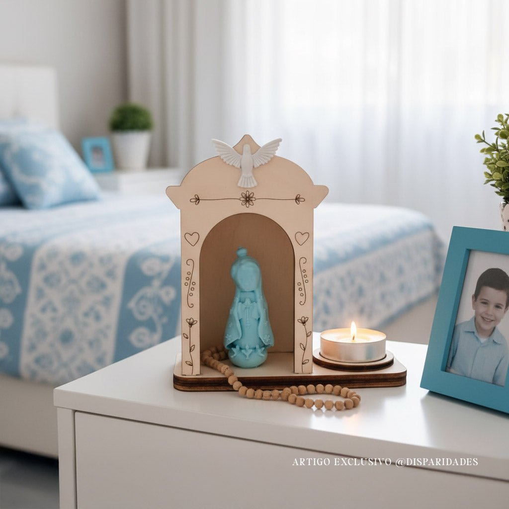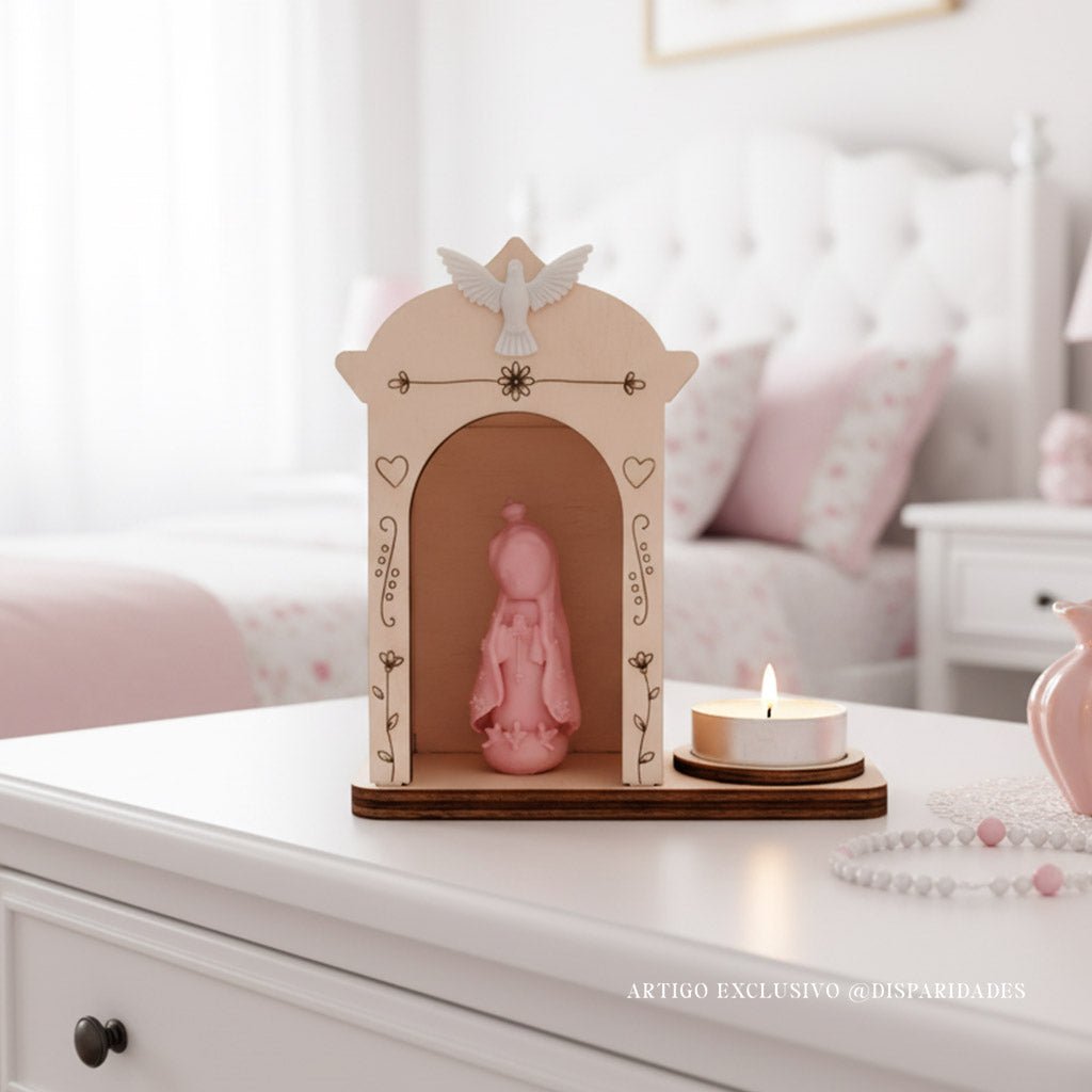 Este Oratório de Nossa Senhora de Fátima para crianças combina tradição e modernidade de uma forma encantadora. Feito em madeira natural e PLA, destaca-se pelo seu design delicado e acolhedor, perfeito para criar um cantinho especial de oração. Com espaço para uma vela LED (não incluída), traz uma luz suave e segura, ideal para momentos de reflexão. Podes ainda personalizar uma mensagem na parte traseira, tornando-o um presente único e cheio de significado. ✨🌿 Um símbolo de fé para acompanhar os pequenos em cada oração.