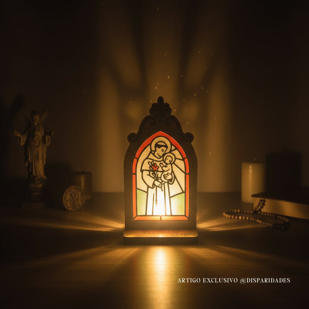 ✨ Oratório de Madeira com Vitral | Santo António ✨ Um gesto de fé com raízes profundas na tradição portuguesa. Este oratório em madeira natural é adornado com um vitral colorido nas cores da bandeira de Portugal — verde, vermelho e dourado — que realça a imagem terna de Santo António com o Menino nos braços. A vela LED incluída ilumina o vitral por trás, criando uma atmosfera de serenidade e espiritualidade perfeita para momentos de oração ou contemplação diária.