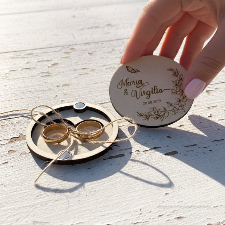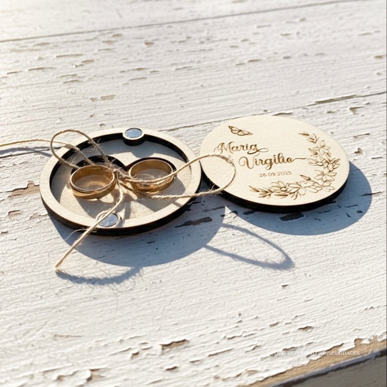 Transforma o teu dia especial num momento mágico com o nosso Porta-Alianças em Madeira 🦋, feito em nobre madeira de okoumé. Este tesouro rústico, com uma tampa equipada com um prático fecho magnético, é adornado com delicadas folhas 🍃 e borboletas 🦋 gravadas a laser, evocando a beleza serena da natureza. Perfeito para guardar as vossas alianças, este porta-alianças não só acrescenta um toque de charme e sofisticação ao vosso grande dia, como também se torna uma lembrança eterna do vosso amor. Escolhe a elegância natural e faz com que o teu momento do "sim" seja tão único quanto a vossa história de amor 💍✨.